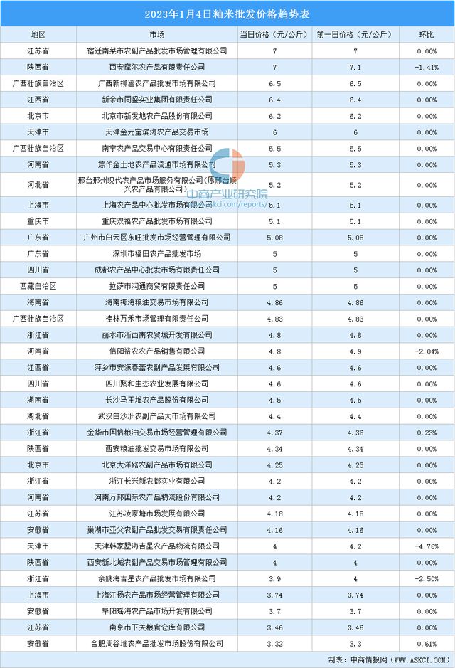 中商情報網(wǎng)訊:最新數據顯示:1月4日,全國粳米當日均價(jià)為5.19元/公斤,秈米當日均價(jià)為4.83元/公斤。其中,粳米價(jià)格最高的市場(chǎng)是位于江西省的新余市同盛實(shí)業(yè)集團有限責任公司,當日價(jià)格為9.3元/公斤,環(huán)比持平。秈米價(jià)格最高的市場(chǎng)是江蘇宿遷南菜市農副產(chǎn)品批發(fā)市場(chǎng)管理有限公司和陜西西安摩爾農產(chǎn)品有限責任公司,當日價(jià)格均為7元/公斤。